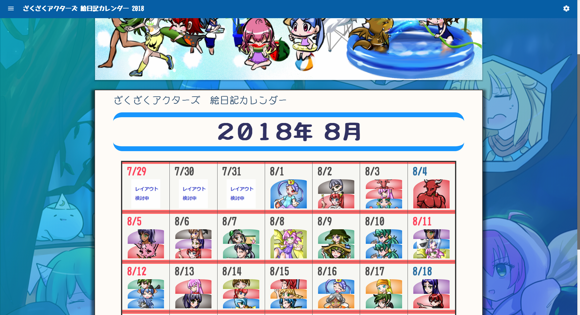 はいっ、カレンダーのトップページ(仮)でーっす。ここから、各キャラの絵日記に直接飛べるようになっているわ。ネタバレを含むので、サムネは小さめにしておくわね。